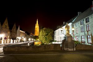 » В просторной церкви с высокой башней в 122 метра хранится единственная скульптура Микеланджело – «Дева Мария с младенцем».
