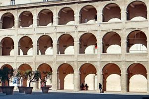 » Внутренняя галерея предназначалась для того, чтобы постояльцы из любой точки могли попасть в молитвенный дом. По центру возвышается церковная постройка. Она украшена многочисленными скульптурными фигурами.
